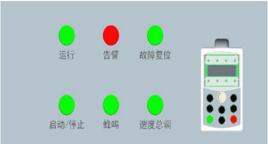 控制面板有啟動/停止旋鈕,速度調節旋鈕,變頻器顯示和設置小面板,還包括運行、蜂鳴、告警指示燈,*作簡單。